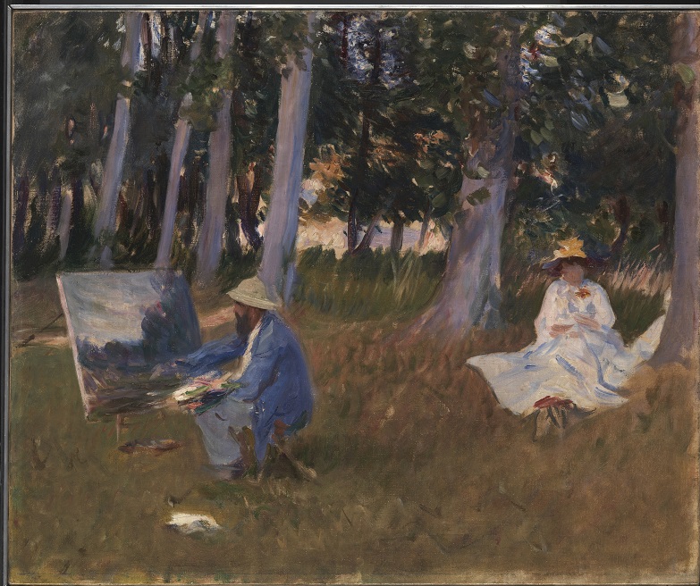 Tijdes een bezoek aan Monet schildert Sargent een van zijn meest impressionistische portretten: Monet die schildert aan de rand van het bos in aanwezigheid van zijn jonge bruid. De uitvinding van de Franse draagbare ‘doos-ezel” of ‘veld-ezel’ met telescopische poten en ingebouwde verfdoos en palet maken het gemakkelijker in de vrije natuur, ‘en plein air’, te schilderen.