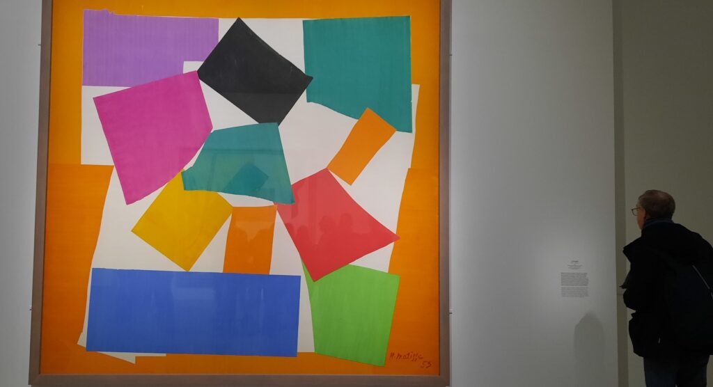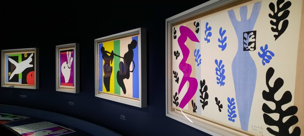 Staand schilderen is heel vermoeiend geworden, dus zoekt Matisse een extra andere uitdrukkingsvorm wat een nieuwe fase van creativiteit inluidt. Hij herontdekt zichzelf door vormen uit geverfd papier te knippen en verheft daardoor knipkunst en collages tot ongekende hoogtes. Zijn gesneden gouaches getuigen van eenvoud en van een universele schoonheid. Een film tijdens de expositie toont hem al knippend, al modellerend en met een stok aanwijzend hoe de compositie moet worden geschikt. Kleur is een belangrijke factor. Hij verwoordt het als volgt: “Rechtstreeks knippen in kleur doet me denken aan het directe beeldhouwwerk van beeldhouwers.”