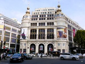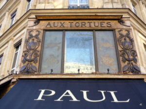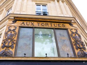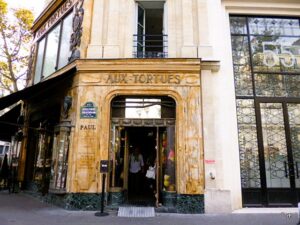 Op 37 rue Tronchet op de hoek met Boulevard Haussmann (8e arr.) is nog een prachtige ingang met etalage te zien uit 1910. Aux Tortues werd in 1864 geopend door Léonidas Garland, handelaar in luxe voorwerpen van ivoor, schildpad en zeldzame houtsoorten, hoogst modieus in die periode: met name schildpad voor koffers, tassen, schoenen, borstels en kammen etc. In 1910 werd de entree opgeknapt tot de huidige staat, vanaf 1984 historisch monument. In de jaren 60 wordt de verkoop van ivoor en schildpad steeds verder terug gedreven en uiteindelijk verboden waardoor Garland omstreeeks 1990 sluit. De winkel is nu een filiaal van de keten Paul Boulangeries. Er is besloten de gevel niet te veranderen maar deze te restaureren zodat iedereen er nog steeds van kan genieten, hulde (let ook op de ramen: er zwemmen schildpadden in) Over het kruispunt heen nog een mooi kijkje op warenhuis Le Printemps.