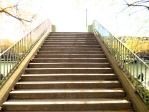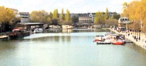 Ik ga van de quai de la Seine (19e arr.) via de Passerelle de la Moselle naar de andere oever, quai de la Loire (ook 19e). Het is even een klim maar bovenop pachtig uitzicht over het Canal, dat hier het Bassin de la Villette heet:
