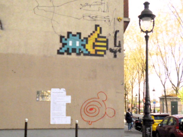 Eenmaal aan de overkant, die nu in de schaduw ligt, een mozaiek van Invader. De dag kan niet meer stuk!
