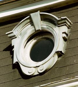 Enkele huizen hebben een dakkapel met een ronde vorm, een zg Oeil-de-boeuf:
